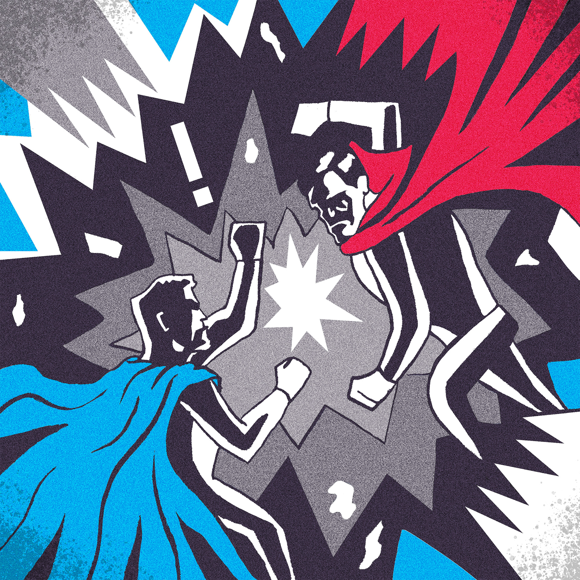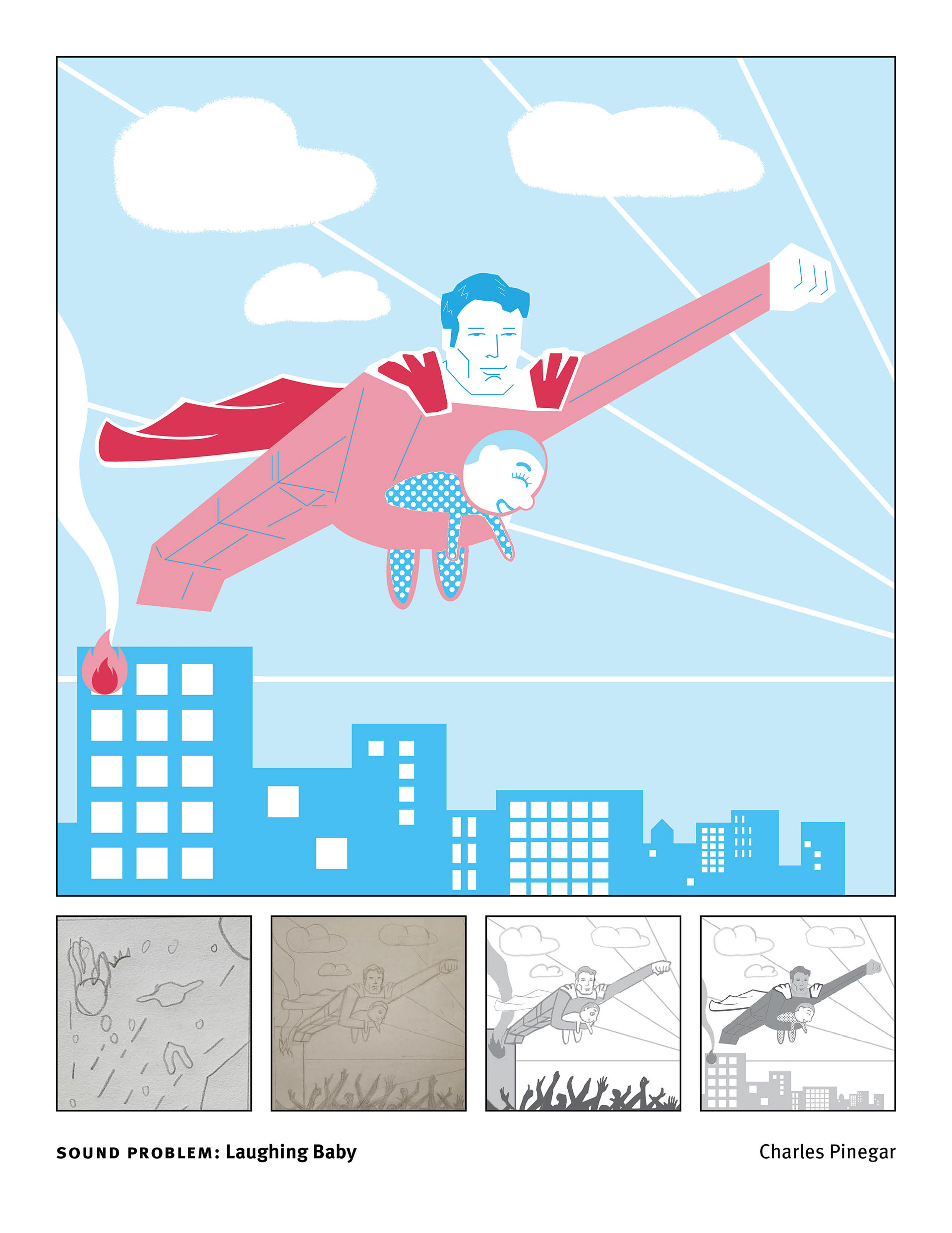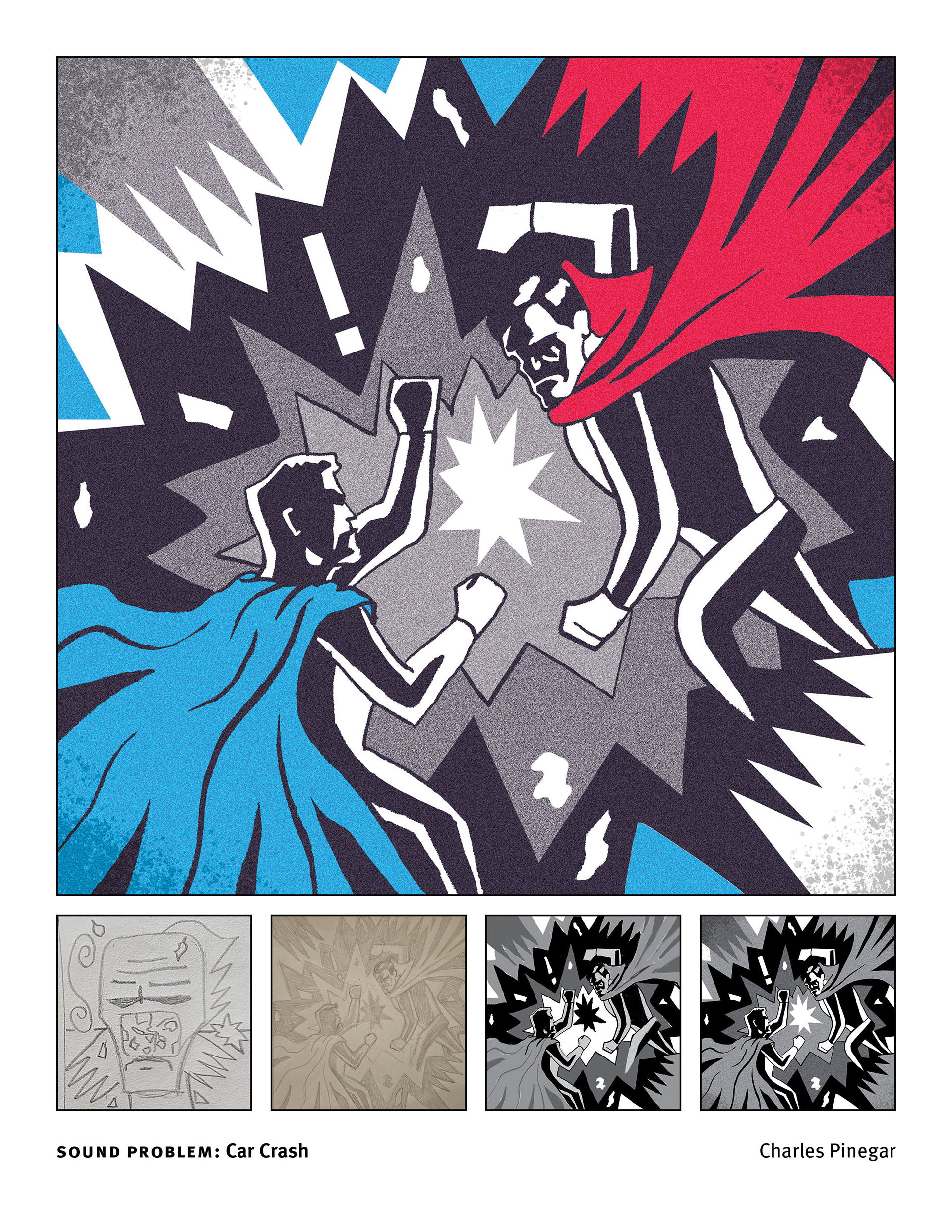 This project involved depicting 3 different sounds while abiding to a unified theme of superheroes, taking inspiration from artist David Plunkert.